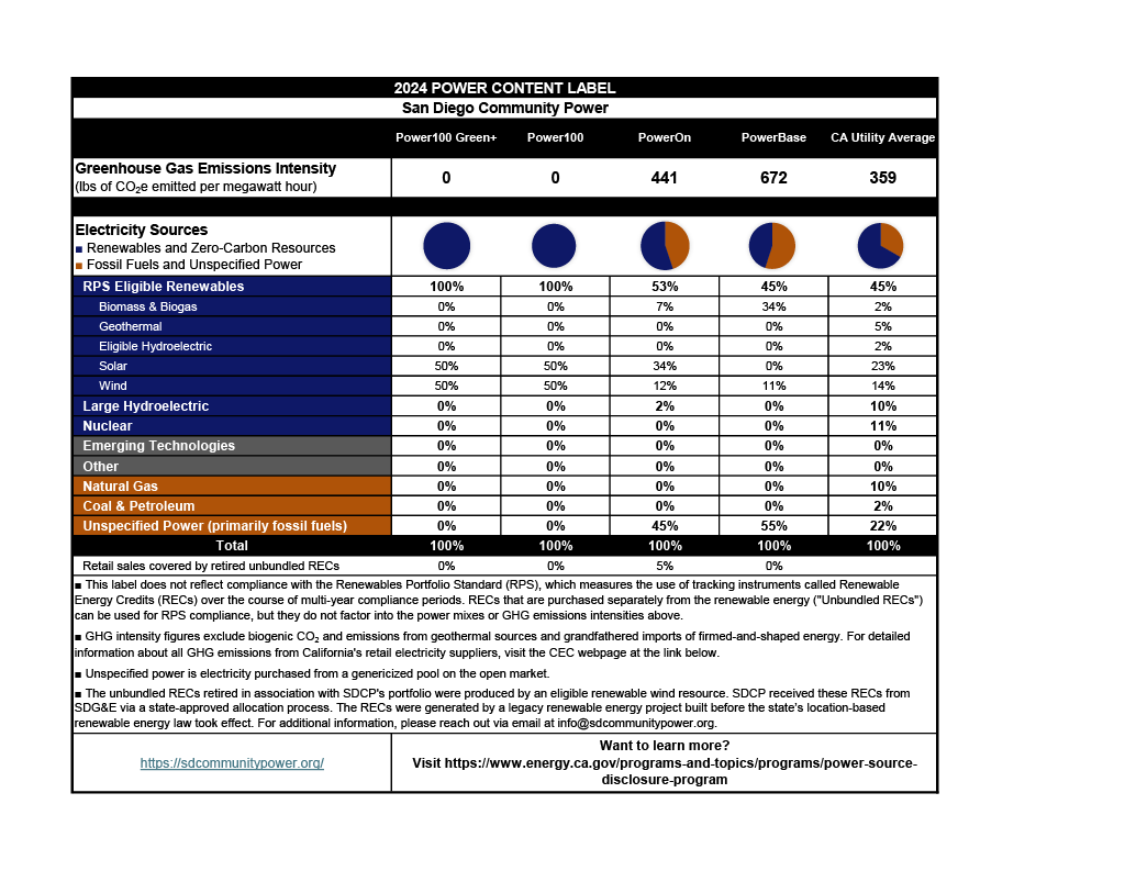 The annual Power Content Label resembles a nutrition label, providing a breakdown of energy sources that make up San Diego Community Power’s power mix, such as solar, wind, geothermal, nuclear, large hydroelectric and natural gas. The Power Content Label allows customers to compare the content of San Diego Community Power’s service plans and provides a summary of California’s energy mix.